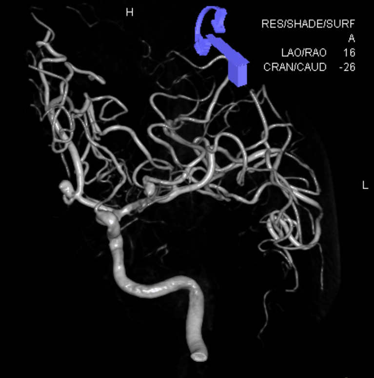 Heute erfolgt die Diagnose in der Regel mit einer Computertomographie-Untersuchung (CT) des Kopfes. Nach Nachweis der Subarachnoidalblutung mit dem „normalen“ CT, erfolgt in unserer Klinik die unmittelbare Durchführung eines Gefäss-CT (Angio-CT). Hierzu steht ein hochmodernes 64-Zeilen CT-Gerät rund um die Uhr zur Verfügung. Mit Hilfe einer speziellen Software ist eine dreidimensionale Darstellung des Aneurymas möglich (s. Bild). Nach Eintreffen des Patienten in die Klinik mit Verdacht auf Subarachnoidalblutung ist so in der Regel innerhalb von 30 Minuten die Diagnose und gegebenenfalls auch der Aneurysmanachweis möglich. Zur Gewinnung weiterer Informationen, insbesondere das Flussverhalten des Blutes betreffend, wird zusätzlich eine sogenannte konventionelle Angiographie durchgeführt. In Abhängigkeit von der Lokalisation und Konfiguration des Aneurysmas wird interdiszplinär zwischen Neuroradiologen und Neurochirurgen die bestmögliche Therapieoption festgelegt und mit dem Patienten und Angehörigen besprochen. Dies betrifft eine mögliche Operation (Aneurysmaclipping) oder interventionelle Behandlung (Coiling siehe Klinik für Radiologie).