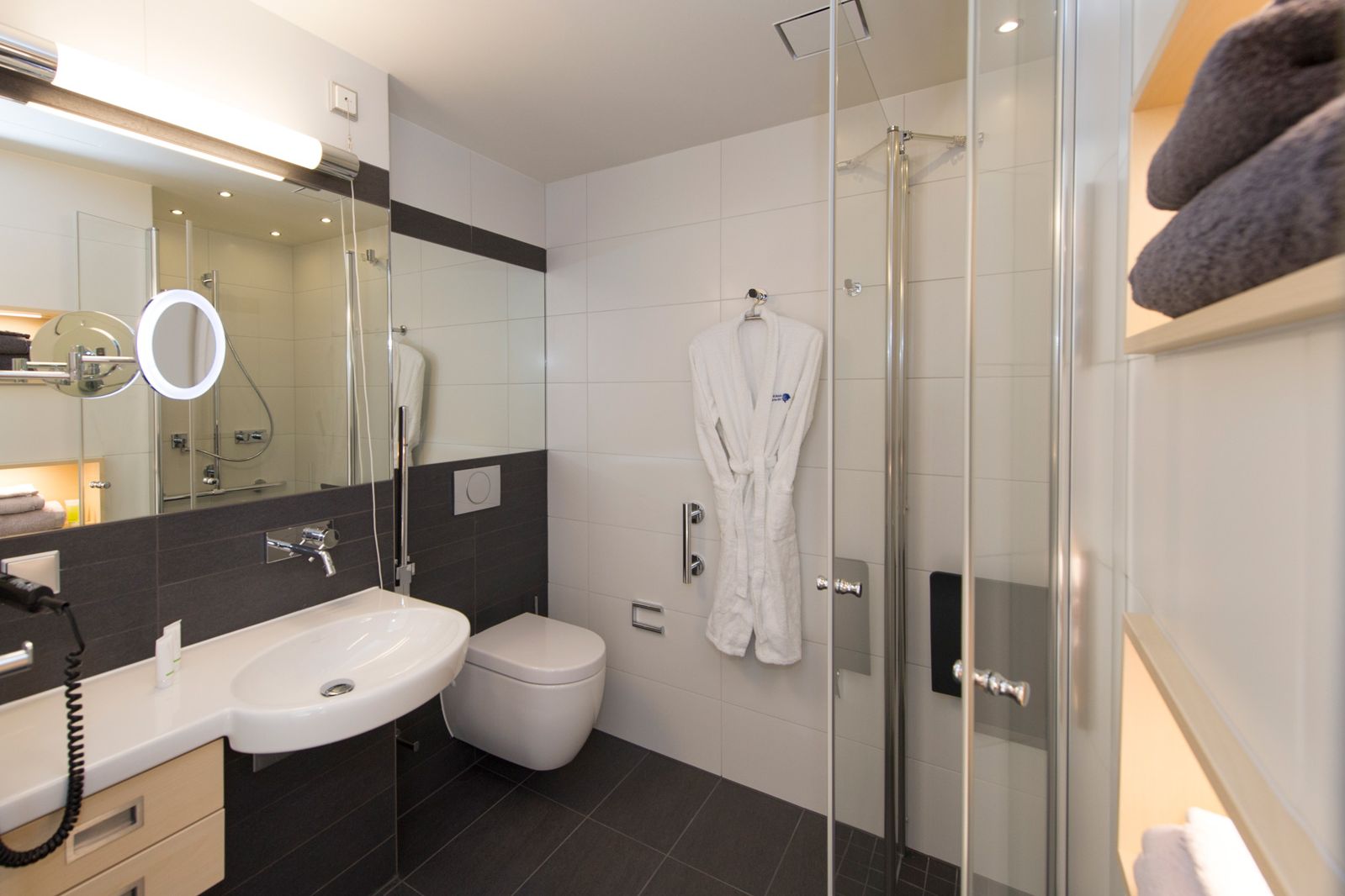 Das hochwertige und moderne Design unserer Duschbäder sorgt für ein besonderes Ambiente. Funktionalität und Barrierefreiheit sind dabei selbstverständlich. Sie finden einen Bademantel und einen Fön. Kostenfreier Wäscheservice und die tägliche Ausgabe der Saarbrücker Zeitung ergänzen unser Angebot. Außerdem steht ein Lounge-Bereich mit frischem Obst, Nachmittagskuchen und einer umfangreichen Kaffeeauswahl zur Verfügung.
